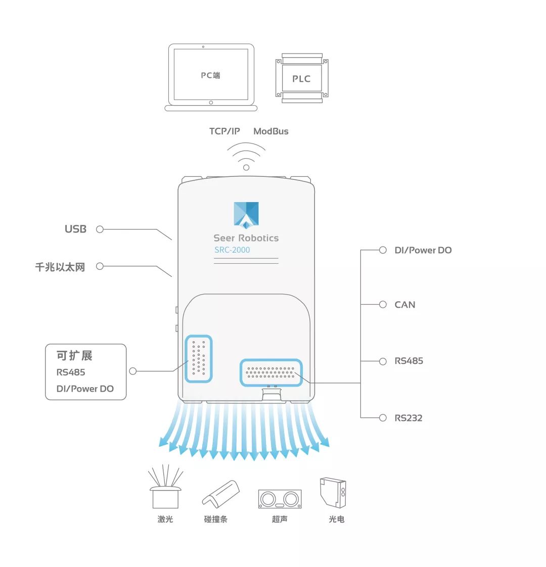 提供豐富的外置接口和通訊總線,包括RS232、RS485、CAN、千兆以太網(wǎng)、USB、DI/Power DO,可適配各類非標(biāo)需求,并提供通明通道方便用戶使用;支持多傳感器安全防護(hù),包括但不限于激光、碰撞條、超聲、光電等軟擴(kuò)展;滿足多種通信協(xié)議,支持ModBus、TCP/IP協(xié)議供外部調(diào)用。