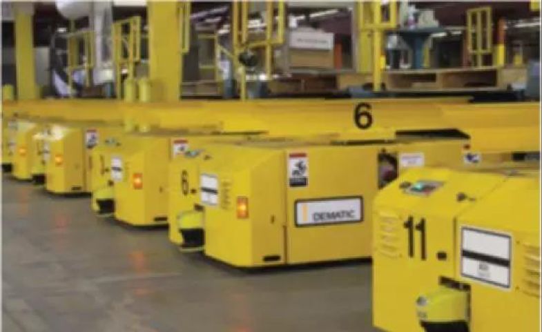 28臺(tái)德馬泰克自動(dòng)導(dǎo)引小車(AGV),采用RF通信和獲得專利的導(dǎo)引系統(tǒng),含有更新的標(biāo)記磁鐵,無(wú)需地面布線,可輕松更改導(dǎo)引路徑,并將貨箱送達(dá)指定地點(diǎn)。