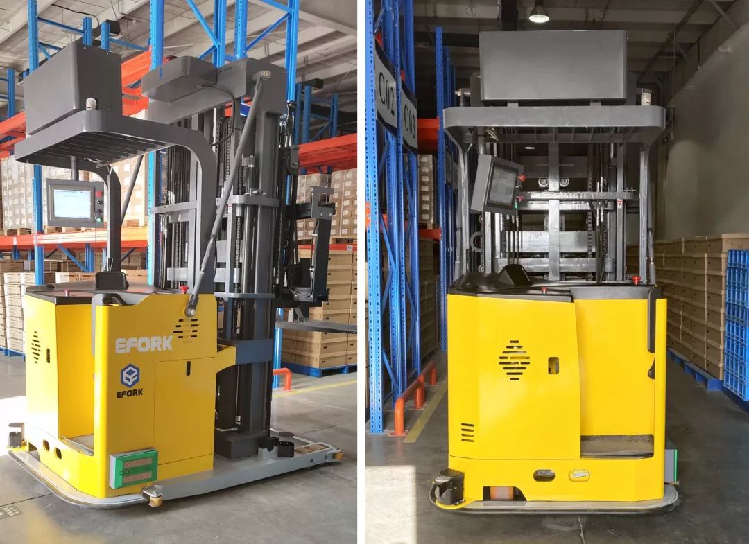 因此,宇鋒智能對(duì)三向堆垛叉車的車體結(jié)構(gòu)、三向堆垛頭進(jìn)行改造,并對(duì)其控制方式進(jìn)行升級(jí),自主研發(fā)了自動(dòng)導(dǎo)引三向堆垛叉車,使得其集普通AGV、電動(dòng)堆垛叉車、有軌堆垛機(jī)之優(yōu)點(diǎn)于一身,能夠解除貨架窄巷道對(duì)普通AGV空間范圍的限制,從而解決了其在窄道中難以轉(zhuǎn)向完成裝卸載貨物的難題。