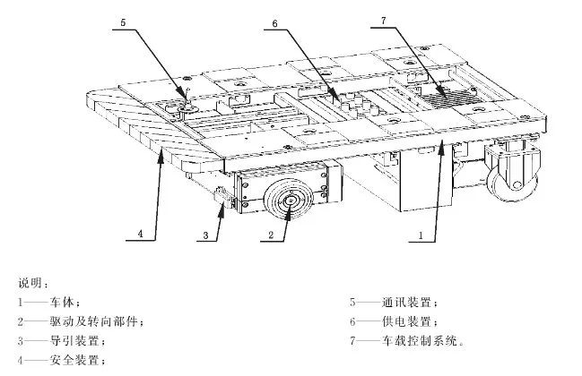 又據(jù)GB/T 30029-2013《自動(dòng)導(dǎo)引車(AGV)設(shè)計(jì)通則》,自動(dòng)導(dǎo)引車的組成主要包括車體、驅(qū)動(dòng)及轉(zhuǎn)向部件、導(dǎo)引裝置、安裝裝置、供電裝置、車載控制系統(tǒng)、通訊裝置,其按移載方式可分為搬運(yùn)型自動(dòng)導(dǎo)引車(transfering AGV)、裝配型自動(dòng)導(dǎo)引車(assembling AGV)及牽引式自動(dòng)導(dǎo)引車(towing AGV)。