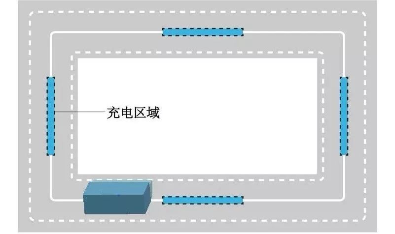 該方案是定點(diǎn)無線充電方案的延伸,在機(jī)器人的行跡路段上部分鋪設(shè)軌道式無線供電。利用超級電容充電速度快的特點(diǎn),當(dāng)機(jī)器人經(jīng)過該路段時(shí)進(jìn)行快速充電補(bǔ)給。特點(diǎn)是,可24小時(shí)連續(xù)工作工作效率高,實(shí)現(xiàn)成本低。
