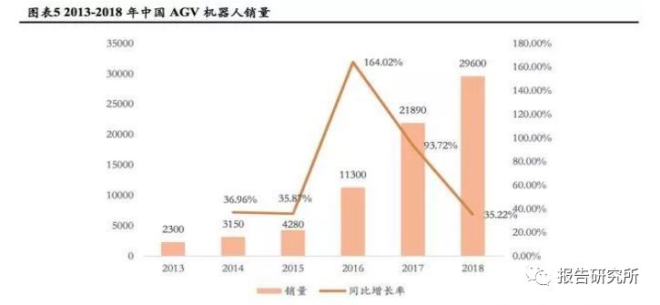 2013年至2018年,中國AGV機器人銷量從最初的2439臺增長至2018年的18000臺(估計值),產(chǎn)業(yè)發(fā)展速度極快。