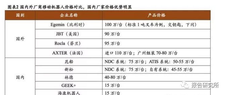 國產(chǎn)機器人具有一定的性價比。國外的AGV產(chǎn)品價格普遍在80-100萬/臺,而國內(nèi)的AGV產(chǎn)品價格普遍在40-70萬元/臺,比國外低50%左右。