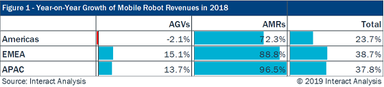 并且根據(jù)Interact Analysis最新發(fā)布的移動(dòng)機(jī)器人市場(chǎng)銷量報(bào)告,2018年AMR全球出貨量超過20,000 ,是2017年銷售量的兩倍。其中包含的地區(qū)(美洲,歐洲,中東和非洲,亞太地區(qū))均實(shí)現(xiàn)了巨大增長(zhǎng),亞太地區(qū)尤其是中國(guó)是推動(dòng)增長(zhǎng)量最大的國(guó)家之一。