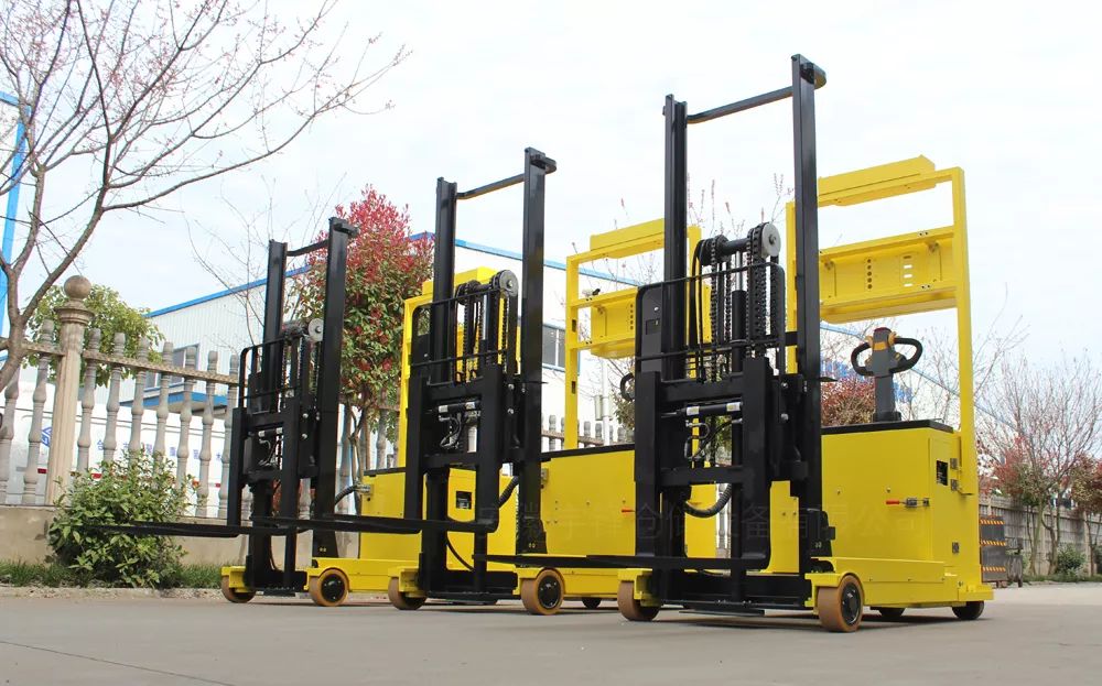 前移式叉車AGV與堆垛式叉車AGV一樣,都是貨物的重心落到車輛的支撐平面內(nèi)。前移式叉車AGV有兩條前伸的支腿,支腿較高,支腿前端有兩個輪子,支腿確保裝卸車在負載時的穩(wěn)定性。相比較而言,堆垛式叉車AGV前輪較大,支腿較高,作業(yè)時支腿不能插入貨物的底部,而前移式叉車AGV門架可以帶著整個起升機構沿著支腿內(nèi)側(cè)的軌道移動,這樣貨叉叉取貨物后稍微起升一定高度即可縮回,保證車輛在運行時的穩(wěn)定性。