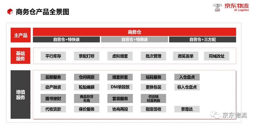 除此以外,商家的貨物在入倉、生產(chǎn)、配送環(huán)節(jié),還會有各種操作類、庫存類、生產(chǎn)類、配送類等的服務(wù)需求,商務(wù)倉可提供24種基礎(chǔ)服務(wù)和增值服務(wù),其中基礎(chǔ)服務(wù)免收服務(wù)費,包括平行庫存、京配打標(biāo)、虛擬組套、批次管理、微笑面單、同城改址6項細(xì)分服務(wù);增值服務(wù)是指依托于主產(chǎn)品的收費服務(wù),包括裝卸服務(wù)、倉間調(diào)撥、組套拆套、貼碼服務(wù)、入倉盤點、經(jīng)營盤點、代收貨款、京尊達(dá)等18項細(xì)分服務(wù)。