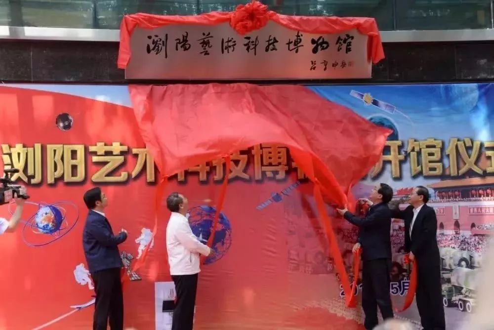 (湖南省委軍民融合發(fā)展委員會辦公室常務(wù)副主任黃東紅;長沙市科技局黨組書記、局長郭塨;原國防科工委司長、中國遙感應(yīng)用理事長羅格;瀏陽市委副書記、市長吳新偉為“瀏陽藝術(shù)科技博物館”揭牌)