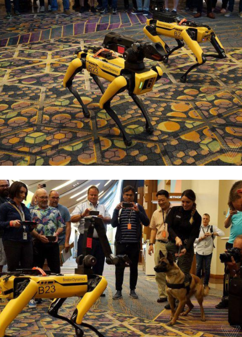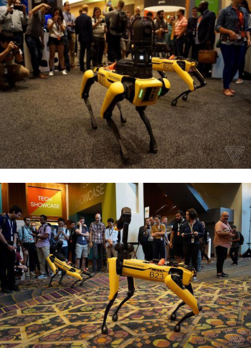 在大會(huì)的第一天晚上,兩個(gè)Spot機(jī)器人和人群混在一起,并由該公司兩名員工監(jiān)督。它們能夠自主地導(dǎo)航環(huán)境,能夠承受踢和推,并在復(fù)雜的地形上保持平衡,但它們不會(huì)自己決定走到哪里。