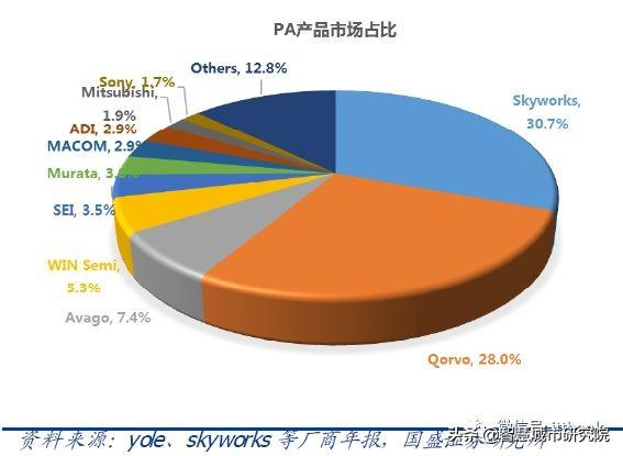 從Yole Development等第三方研究機(jī)構(gòu)估算來看,2017年全球用于PA的GaAs 器件市場規(guī)模達(dá)到80-90億美元,大部分的市場份額集中于Skyworks、Qorvo、Avago 三大巨頭。預(yù)計(jì)隨著通信升級未來兩年有望正式超過100億美元。