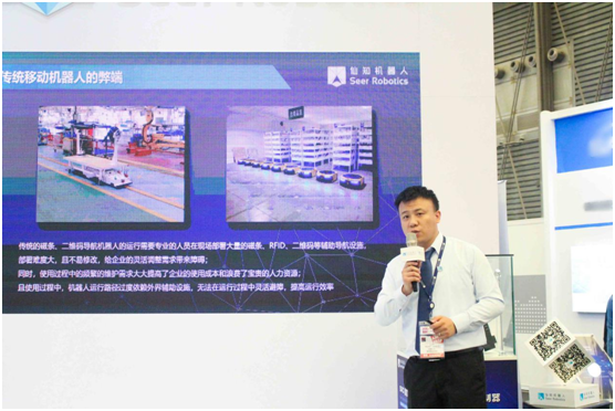 展臺上的這臺基于AMB系列無人搬運底盤的牽引式移動機器人,首次重磅亮相在展會現(xiàn)場,便受到了現(xiàn)場觀眾的熱切關注。