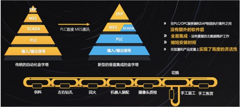 這一年德國政府提供給中國工信部領(lǐng)導(dǎo)參觀的,是一家實施了 SAP 的德國工業(yè)燃氣具生產(chǎn)企業(yè) Elster。實際上,盡管 Elster 的一條生產(chǎn)線上已經(jīng)可以實現(xiàn)多品種小批量的生產(chǎn),在水平集成上也可圈可點,但是使用垂直集成打通工業(yè)金字塔的概念,與國內(nèi)推行的「兩化融合」的思想高度契合,給來訪的中國領(lǐng)導(dǎo)和專家們留下了深刻的印象。那幾年,也是垂直集成概念在國內(nèi)數(shù)字化工廠最為風行的幾年,不少人將能夠與 ERP 和 PLC 連接的 MES,看成是實現(xiàn)工業(yè)4.0的標配,興起了一股開發(fā)各行各業(yè) MES 系統(tǒng)的高潮。無疑,這為大規(guī)模建設(shè)工業(yè)4.0數(shù)字化工廠奠定了一個起點。