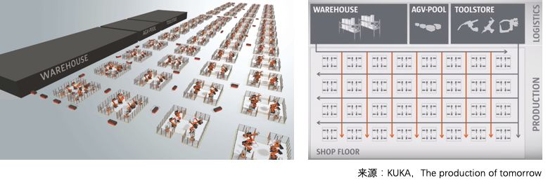從今天的經(jīng)驗和認知來看,這些描述聽起來簡直是天方夜譚。但是,在德國工業(yè)4.0技術(shù)的推動下,這一幻想正在逐漸變?yōu)楝F(xiàn)實。從推動代工生產(chǎn)的視角,德國庫卡機器人將其稱為矩陣式生產(chǎn)(Matrix Production);從產(chǎn)業(yè)應(yīng)用的視角,將其應(yīng)用到實戰(zhàn)的德國大眾把它叫做模塊化生產(chǎn)(Modular Production)。
