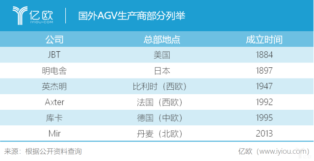 億歐物流通過(guò)梳理發(fā)現(xiàn),整體來(lái)看,國(guó)外AGV生產(chǎn)商普遍有較深的歷史沉淀,這與國(guó)家所處的發(fā)展階段有著非常直接的關(guān)系。