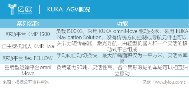 從上表也可以看出,KUKA對(duì)于自身AGV的定位分工還是比較明確的,靈活型、重載型皆有涉及。值得一提的是,KUKA在產(chǎn)品方面做得比較極致,產(chǎn)品是輕型AGV,可以在1平方米內(nèi)工作;是重載型AGV,它的負(fù)載能力可達(dá)90噸,而且在重視負(fù)載能力的同時(shí),靈活性也得到較好的兼顧。KUKA的AGV主要應(yīng)用在材料處理、機(jī)床裝料、裝配、包裝、堆垛、焊接、表面修整等場(chǎng)景領(lǐng)域。