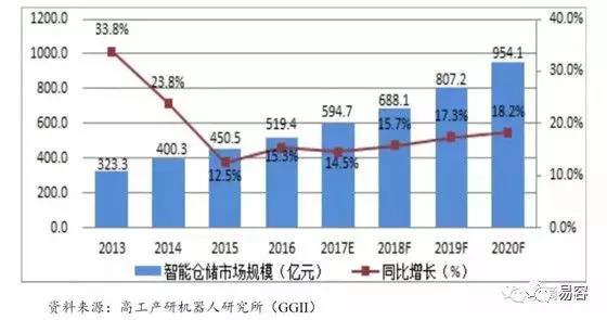高工產(chǎn)研機(jī)器人研究所(GGII)認(rèn)為,中國(guó)經(jīng)濟(jì)的持續(xù)健康發(fā)展和中國(guó)物流業(yè)的崛起為倉(cāng)儲(chǔ)業(yè)的發(fā)展提供了巨大的市場(chǎng)需求,加上制造業(yè)、商貿(mào)流通業(yè)外包需求的釋放和倉(cāng)儲(chǔ)業(yè)戰(zhàn)略地位的加強(qiáng),未來(lái)智能倉(cāng)儲(chǔ)存在巨大市場(chǎng)需求,預(yù)計(jì)到2020 年,智能倉(cāng)儲(chǔ)市場(chǎng)規(guī)模將超過(guò)954 億元。