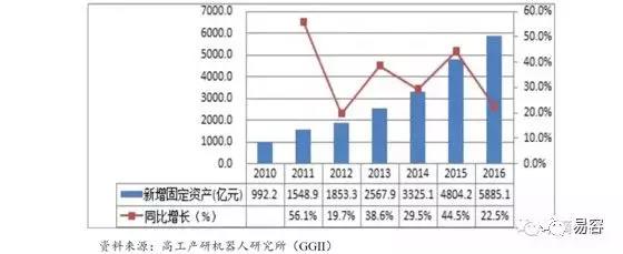 從行業(yè)供應(yīng)方面來(lái)看,高工產(chǎn)研機(jī)器人研究所(GGII)數(shù)據(jù)顯示,2016 年,倉(cāng)儲(chǔ)行業(yè)新增固定資產(chǎn)規(guī)模達(dá)5,885.1 億元,同比增長(zhǎng)22.5%。從數(shù)據(jù)可以看出,固定資產(chǎn)規(guī)模正急劇擴(kuò)張,由2010 年的992.2 億元增長(zhǎng)至2016 的5,885.1億元,年復(fù)合增長(zhǎng)率達(dá)34.5%。