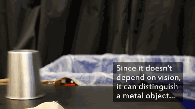 緊接著,借助兩個(gè)壓力傳感器,測(cè)量抓住物體所需力的大小,進(jìn)而確定材料剛度,定制軟件會(huì)將這些數(shù)據(jù),與相應(yīng)數(shù)據(jù)庫(kù)中的材料數(shù)據(jù)進(jìn)行比對(duì),最后機(jī)器人會(huì)將物品彈出到正確的箱子中