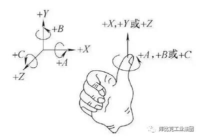 機器人的各種坐標(biāo)系都由正交的右手定則來決定,如圖1所示。當(dāng)圍繞平行于X 、Y 、Z 軸線的各軸旋轉(zhuǎn)時,分別定義為A 、B 、C 。A 、B 、C 的正方向分別是X 、Y 、Z 正方向上右手螺旋前進的方向(見圖2)。