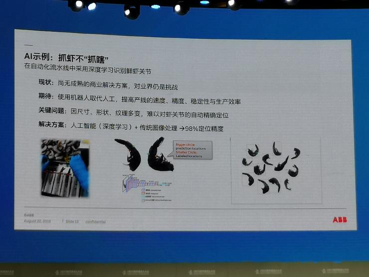 在湛江,ABB有一家合作的公司,這是國(guó)內(nèi)最大的海鮮制品公司,其產(chǎn)線基本是全程自動(dòng)化,除了一個(gè)環(huán)節(jié)。當(dāng)我們?cè)诒貏倏统曾P尾蝦時(shí),要先把皮去掉,如何讓不同形狀大小的蝦讓機(jī)器識(shí)別,既能保證足夠的肉又能夠把皮剝掉?這個(gè)環(huán)節(jié)必須由人完成,所以給人0.5平米的工位,人就站在那里八小時(shí)不停地把蝦扒出來(lái)放到指定位置。不說(shuō)這個(gè)工作很辛苦,光是味道就會(huì)讓你覺(jué)得很難受。