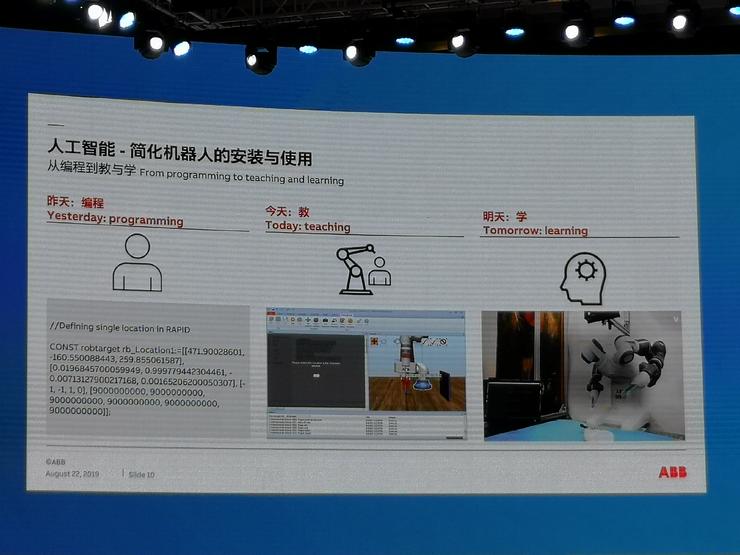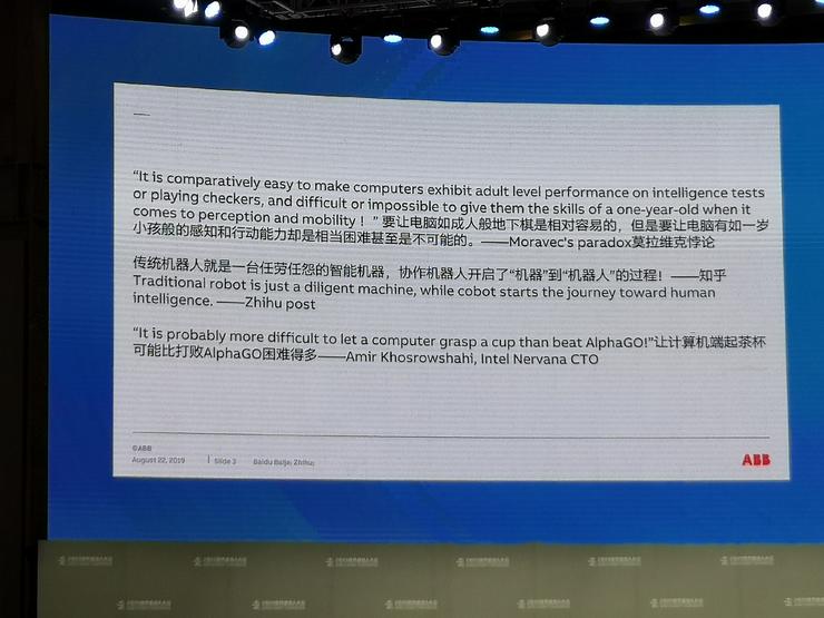 8月20日-25日,“2019世界機(jī)器人大會(huì)”在北京亦創(chuàng)國(guó)際會(huì)展中心舉行。8月22日,ABB(中國(guó))有限公司首席技術(shù)官劉前進(jìn)在新興應(yīng)用與實(shí)踐論壇作了主題為《機(jī)器與人:從共存到共事》的報(bào)告。