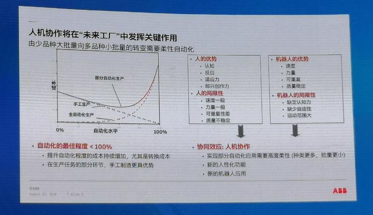 現(xiàn)如今,人類(lèi)與機(jī)器人的關(guān)系,已從過(guò)去的競(jìng)爭(zhēng)變成了現(xiàn)在的協(xié)作,也就是從競(jìng)爭(zhēng)、共存、協(xié)作到未來(lái)的共事。例如在一些3C工廠,工人一天八到十個(gè)小時(shí)重復(fù)站在那里去做同一件工作,那么對(duì)這種工作,我們希望他可以完全被自動(dòng)化替代。同時(shí),利用人類(lèi)的認(rèn)知、適應(yīng)或者創(chuàng)造等能力去做更加有意義的工作。