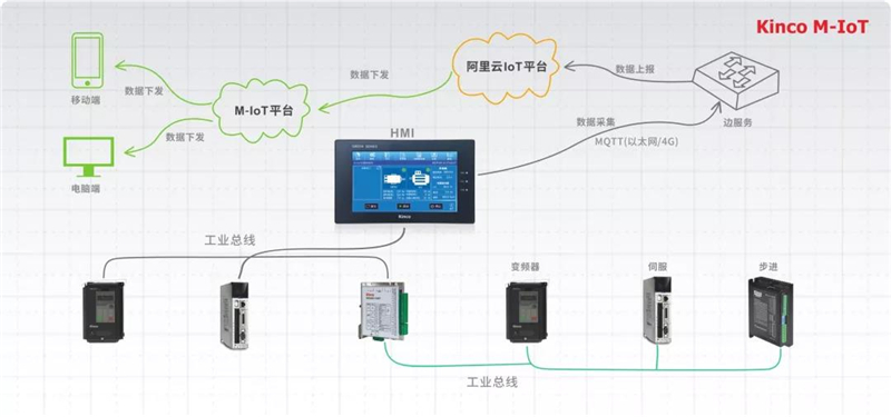 步科推出M-IoT機(jī)器物聯(lián)網(wǎng)解決方案,通過工業(yè)現(xiàn)場(chǎng)總線,將PLC、變頻器、伺服驅(qū)動(dòng)器、步進(jìn)驅(qū)動(dòng)器等的運(yùn)行數(shù)據(jù)上傳至HMI或邊緣服務(wù)器,再通過MQTT協(xié)議,將核心部件的運(yùn)行數(shù)據(jù)上傳至云端,使得現(xiàn)場(chǎng)運(yùn)維人員可以通過手機(jī)、平板電腦或其他無線設(shè)備遠(yuǎn)程訪問設(shè)備信息,獲取實(shí)時(shí)在線數(shù)據(jù),從而實(shí)現(xiàn)故障預(yù)診斷分析、遠(yuǎn)程監(jiān)控等多種智能服務(wù),幫助用戶及早發(fā)現(xiàn)設(shè)備早期故障、減少避免重大損失、有限延遲設(shè)備壽命、降低運(yùn)維管理成本、提高生產(chǎn)效率。