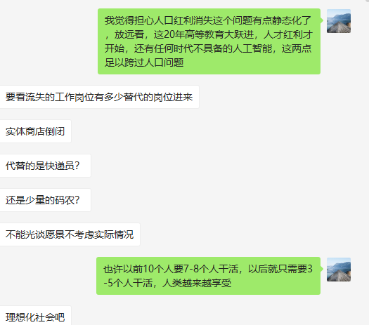 那么面對(duì)人口紅利消失問題,是不是我們經(jīng)濟(jì)就注定要未富先老,前途暗淡,一蹶不振?我想也未必,先切上一段聊天記錄(上圖),我們有三大優(yōu)勢(shì):人才紅利顯現(xiàn),機(jī)器成本下降,人工智能助力,有的是時(shí)代賦予的,有的是自身努力結(jié)果,三大護(hù)法加持,無懼轉(zhuǎn)型風(fēng)浪。