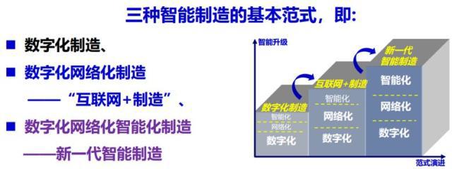 首先,智能制造可以歸納為三種范式:數(shù)字化制造、“互聯(lián)網(wǎng)+制造”、新一代智能制造(數(shù)字化、網(wǎng)絡(luò)化、智能化)。