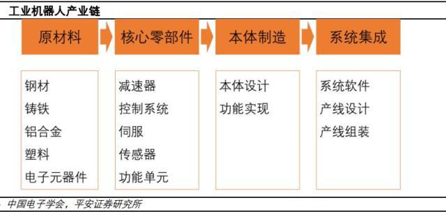 上游是核心零部件,中游是自動(dòng)化加工設(shè)備(工業(yè)機(jī)器人等),下游是自動(dòng)化集成(各應(yīng)用領(lǐng)域);