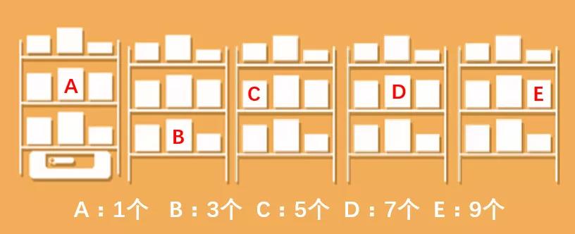如下圖,例如某品牌墨鏡的庫存有5條,分列在A、B、C、D、E這5個貨架上,其對應數(shù)量分別是1、3、5、7、9個。