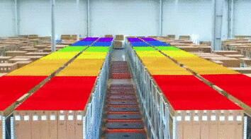 將預測得到每種物料未來一天的出庫量作為衡量物料冷熱度的關鍵指標,判斷貨架的冷熱度,再調度機器人實時動態(tài)調整貨架位置。如下圖,紅色區(qū)塊代表高熱度貨架,會優(yōu)先排布到離揀選臺更近的地方。