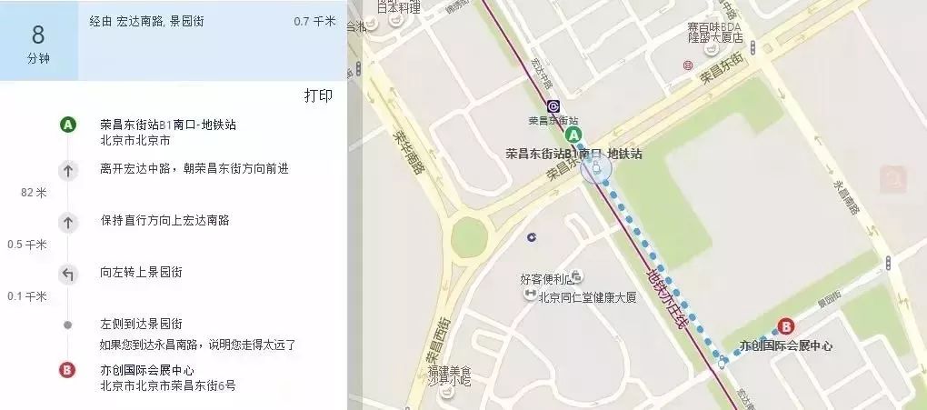 地鐵:地鐵亦莊線榮昌東街站(B1南口出),步行約700米(8分鐘),路線如下圖所示。