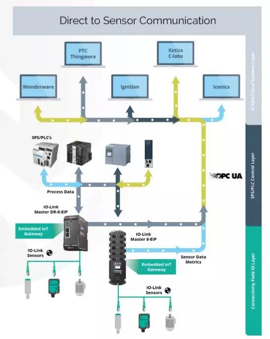 倍加福Comtrol的IO-Link主站模塊,在將傳感器過程數(shù)據(jù)發(fā)送給PLC平臺的同時,還可以通過Modbus TCP或OPC UA向上層的工業(yè)物聯(lián)網(wǎng)/工業(yè)4.0云解決方案或者SCADA系統(tǒng),發(fā)送傳感器的服務(wù)數(shù)據(jù)和過程數(shù)據(jù)。