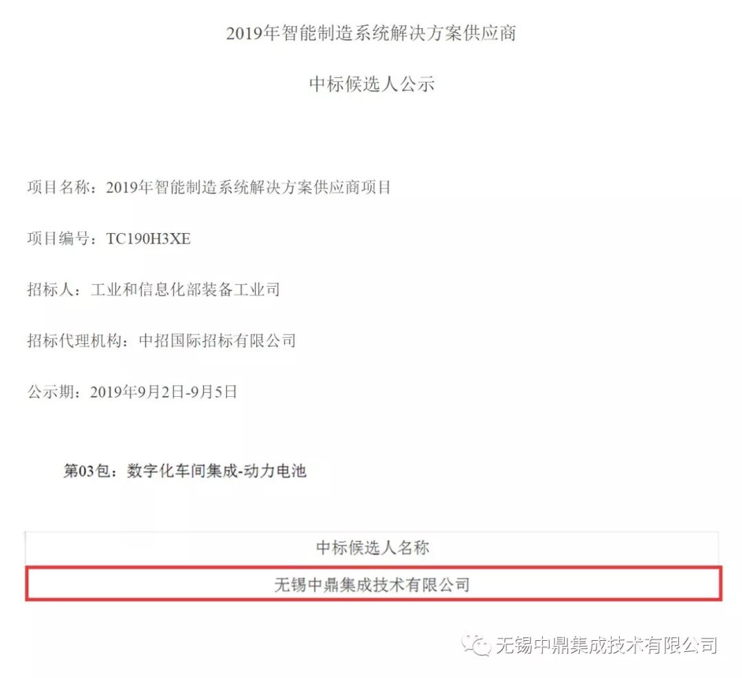 9月5日,國家工業(yè)與信息部裝備司《2019年智能制造系統(tǒng)解決方案供應商》公示完成,無錫中鼎集成技術有限公司成功入選“數(shù)字化車間集成-動力電池”項目包,此批全國共有58家企業(yè)入選。