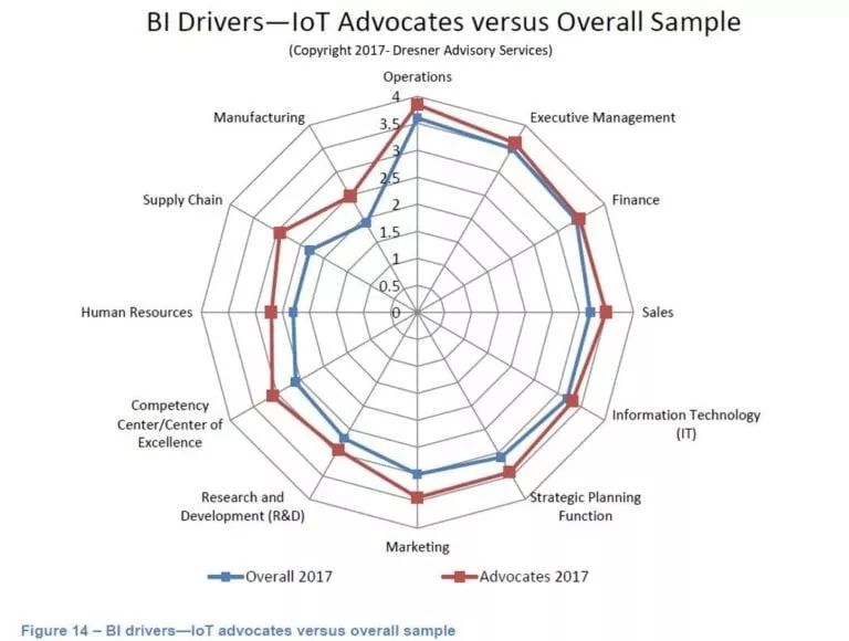 制造和供應(yīng)鏈管理,包括庫(kù)存管理和商業(yè)智能能力中心(BICC)是企業(yè)采用物聯(lián)網(wǎng)的最有力的催化劑之一。下圖中定義的BI采用的12個(gè)功能驅(qū)動(dòng)因素的活動(dòng)水平越高,物聯(lián)網(wǎng)根據(jù)不同地區(qū)的獨(dú)特需求提供差異化價(jià)值的潛力就越大。 包括庫(kù)存管理在內(nèi)的供應(yīng)鏈管理是物聯(lián)網(wǎng)應(yīng)用中最活躍的早期采用者,其次是營(yíng)銷(xiāo)、銷(xiāo)售和戰(zhàn)略規(guī)劃。在戰(zhàn)略規(guī)劃的上下文中,這12個(gè)采用領(lǐng)域與公共數(shù)據(jù)捕獲、聚合、報(bào)告和性能改進(jìn)目標(biāo)同步。供應(yīng)鏈?zhǔn)侨魏纹髽I(yè)的命脈,它將12個(gè)領(lǐng)域統(tǒng)一為一個(gè)統(tǒng)一的、有凝聚力的戰(zhàn)略。