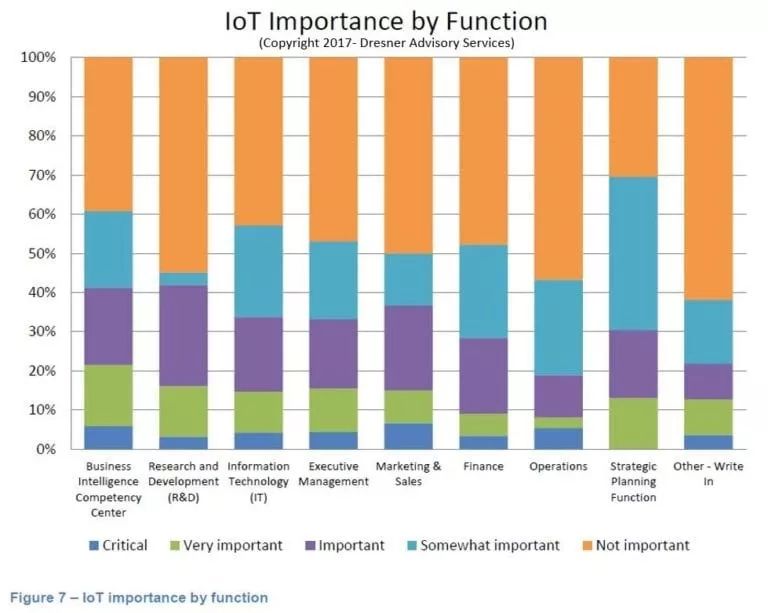 制造業(yè)、咨詢(xún)、商業(yè)服務(wù)和物流配送是目前引領(lǐng)物聯(lián)網(wǎng)應(yīng)用的四大行業(yè),并將在2020年前加速。德累斯頓咨詢(xún)服務(wù)公司(Dresner Advisory Services)最近的一項(xiàng)研究發(fā)現(xiàn),物聯(lián)網(wǎng)最大的潛在價(jià)值在于簡(jiǎn)化最復(fù)雜的制造過(guò)程,包括配送、物流和倉(cāng)庫(kù)管理。物聯(lián)網(wǎng)的早期采用者通常定義的目標(biāo)具有明確的收入和競(jìng)爭(zhēng)優(yōu)勢(shì),以推動(dòng)計(jì)劃。制造業(yè)、咨詢(xún)、商業(yè)服務(wù)和分銷(xiāo)/物流代表著具有挑戰(zhàn)性和競(jìng)爭(zhēng)力的行業(yè),這些行業(yè)的收入增長(zhǎng)往往難以實(shí)現(xiàn)。提供收入和競(jìng)爭(zhēng)優(yōu)勢(shì)的物聯(lián)網(wǎng)計(jì)劃是最快、最有可能獲得資金和支持的。德累斯頓咨詢(xún)服務(wù)公司(Dresner Advisory Services)的《2017物聯(lián)網(wǎng)(IoT)智能市場(chǎng)研究》(2017 Internet of Things (IoT) Intelligence Market study)總結(jié)了行業(yè)對(duì)物聯(lián)網(wǎng)重要性的研究,并在《福布斯》(Forbes)上發(fā)表了如下圖表: