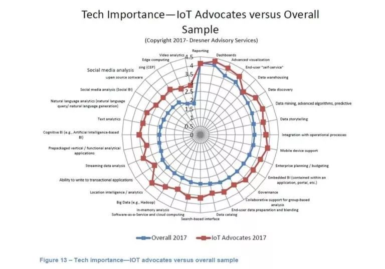德累斯頓咨詢(xún)服務(wù)公司(Dresner Advisory Services)最近的一項(xiàng)研究顯示,將物聯(lián)網(wǎng)平臺(tái)與位置智能(location intelligence)、流數(shù)據(jù)分析和認(rèn)知BI整合在一起,在供應(yīng)鏈和倉(cāng)庫(kù)管理等多個(gè)功能領(lǐng)域,都能帶來(lái)最大的商業(yè)效益。與之前的研究一致,更廣泛的受訪(fǎng)者群體和物聯(lián)網(wǎng)早期采用者都高度重視報(bào)告和儀表板,以提供更大的供應(yīng)鏈可視性和控制。 德累斯頓的研究還發(fā)現(xiàn),物聯(lián)網(wǎng)的早期采用者也看到了可視化和終端用戶(hù)自助服務(wù)的更大重要性,尤其是在供應(yīng)鏈和倉(cāng)庫(kù)管理方面。物聯(lián)網(wǎng)通過(guò)提高數(shù)據(jù)驅(qū)動(dòng)決策的質(zhì)量,正在徹底改變倉(cāng)庫(kù)管理的這一方面。下圖概述了物聯(lián)網(wǎng)早期采用者對(duì)物聯(lián)網(wǎng)及其相關(guān)技術(shù)的偏好: