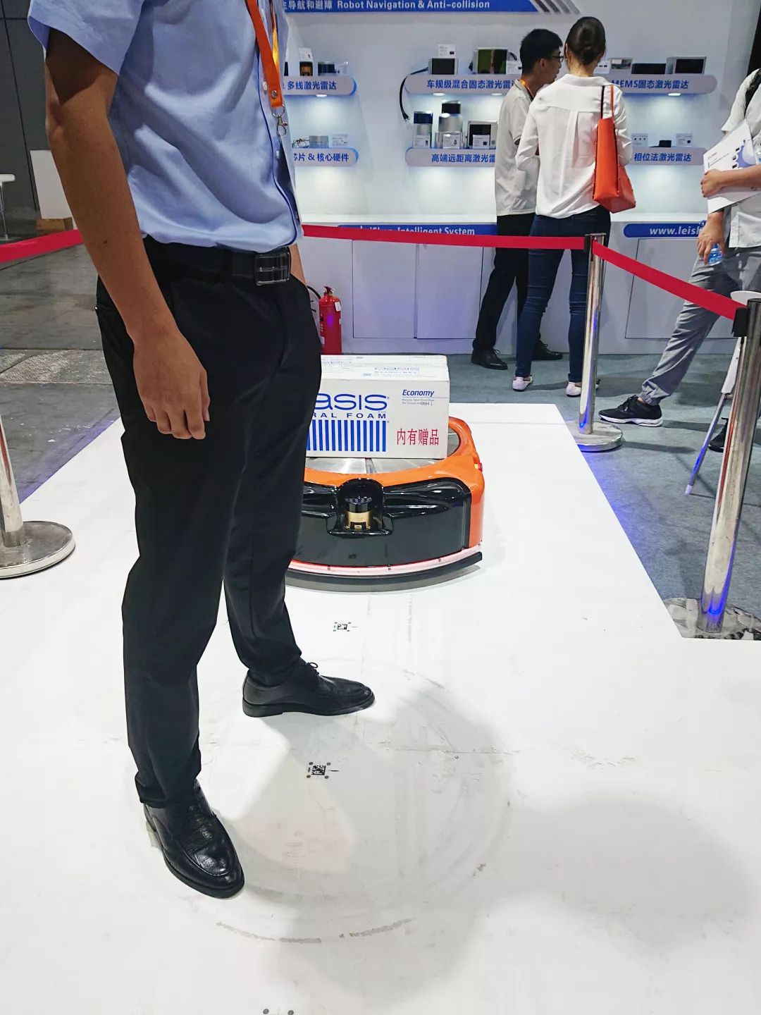 參展買家們正在觀看和體驗(yàn)AGV機(jī)器人自主導(dǎo)航、避障應(yīng)用演示