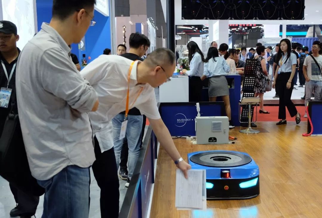 靈活柔性、外觀簡潔緊湊的牧星機器人收獲了大批現(xiàn)場觀眾的青睞。來自不同國家、不同年齡層的觀眾都為牧星智能機器人駐足。為期五天的展會上,牧星智能的展位總是人潮涌動,場面異?;馃?。眾多觀眾主動要求親自體驗?zāi)列歉呖萍?a href="http://m.wnmc.org.cn/sell/" title="產(chǎn)品" target="_blank">產(chǎn)品的先進功能,在功能展示區(qū)內(nèi)分別動手操作進行智能呼叫、釋放,智能避障、貨架搬運等作業(yè)流程。
