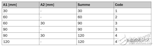 通過(guò)磁塊標(biāo)記距離導(dǎo)航磁條中心的距離來(lái)表現(xiàn)不同的代碼,如下表