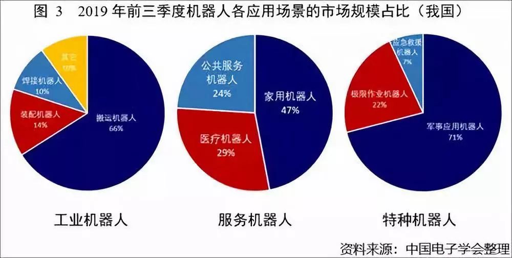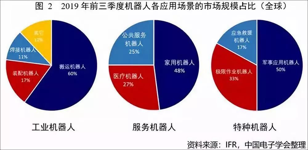 CIE智庫近日發(fā)布的數(shù)據(jù)顯示,2019年前三季度我國機(jī)器人市場規(guī)模為69.5億美元,其中工業(yè)機(jī)器人市場規(guī)模為48.6億美元,同比增長33%,其中,搬運(yùn)機(jī)器人規(guī)模占比達(dá)66%,其次為裝配機(jī)器人與焊接機(jī)器人,占比分別為14%及10%。