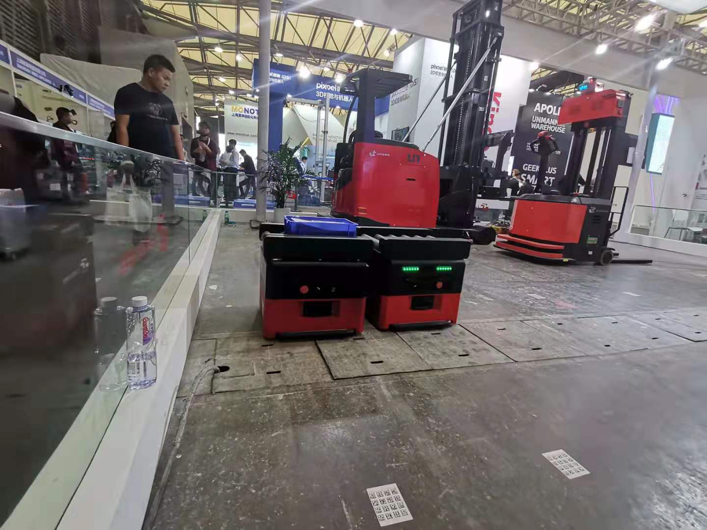1、展示區(qū)共有500kgslam頂升式IGV1臺(tái)、100kg移載式IGV2臺(tái)、500kg頂升式IGV1臺(tái)、1600kg激光堆高叉車1臺(tái),