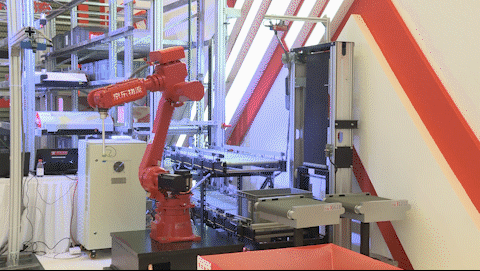 ▲京東物流六軸機(jī)械臂與飛馬二代機(jī)AGV進(jìn)行協(xié)作