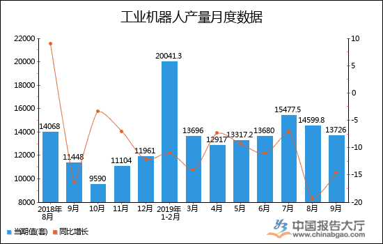 根據(jù)中國報告大廳對2019年1-9月全國工業(yè)機器人產量進行監(jiān)測統(tǒng)計顯示:2019年9月全國工業(yè)機器人產量13726套,同比下降14.6%,2019年1-9月全國工業(yè)機器人產量為133574.5套,累計下降9.1%。