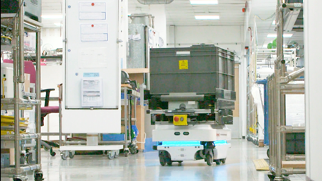 最多載重100公斤的MiR100機器人在霍尼韋爾生產(chǎn)車間內(nèi)往來運輸