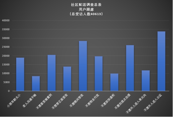 十個調(diào)查問題當中,選擇“不愿晚間簽收”和“不愿外人進入公區(qū)”兩項的受訪人數(shù)最多,可見用戶對自身安全和公區(qū)安全的防范度最高;選擇“不愿家里被看到”的用戶超過20,000人,說明現(xiàn)在的家庭相當在意隱私保護。在物業(yè)代收、快遞柜、自提點三個選項里,超過六成受訪用戶明確拒絕自提點,拒絕物業(yè)代收的人數(shù)也已經(jīng)過半。