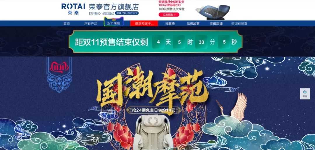 榮泰健康主營按摩椅,其天貓旗艦店曾多次在雙十一期間榮獲行業(yè)銷冠。