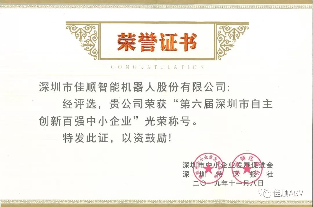 截止2019年11月8日下午,第六屆深圳市自主創(chuàng)新百強中小企業(yè)評選活動正式結(jié)束,首先恭喜深圳市佳順智能機器人股份有限公司再次榮獲深圳市自主創(chuàng)新百強中小企業(yè),佳順智能此次再獲此殊榮,感謝社會各界朋友的大力支持!更離不開佳順智能每一位奮斗者的努力。