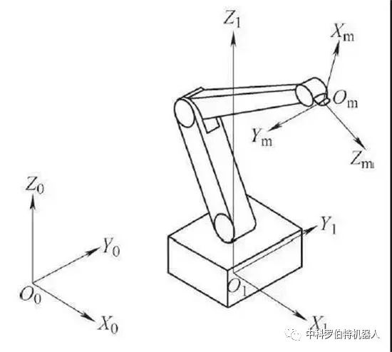 絕對坐標(biāo)系與機器人的運動無關(guān),以地球為參照系的固定坐標(biāo)系,符號為O0、X0、Y0、Z0。原點O0、X軸正方向由用戶的需要來確定;+Z軸與重力加速度的矢量共線,也就是Z軸垂直于地面,但方向是相反的。機座坐標(biāo)系是以機器人機座安裝平面為參照系的坐標(biāo)系,符號為O1、X1、Y1、Z1。原點O1由機器人制造廠規(guī)定;+Z1軸垂直于機器人機座安裝面,指向機器人機體;X1軸方向由原點指向機器人工作空間中心點Cw在機座安裝面上的投影。當(dāng)由于機器人的構(gòu)造不能實現(xiàn)此約定時,X1軸的方向可由制造廠規(guī)定。