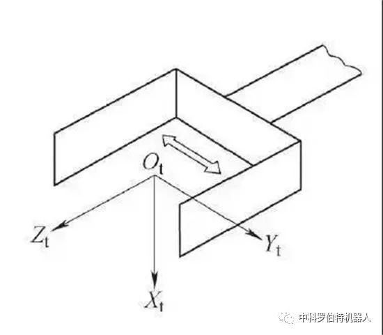工具坐標(biāo)系以安裝在機械接口上的末端執(zhí)行器為參照系,符號為Ot、Xt、Yt、Zt。原點Ot是工具中心點;+Zt軸與工具有關(guān),通常是工具指向;在平板式夾爪型夾持器夾持時,+Yt是手指運動平面的方向。